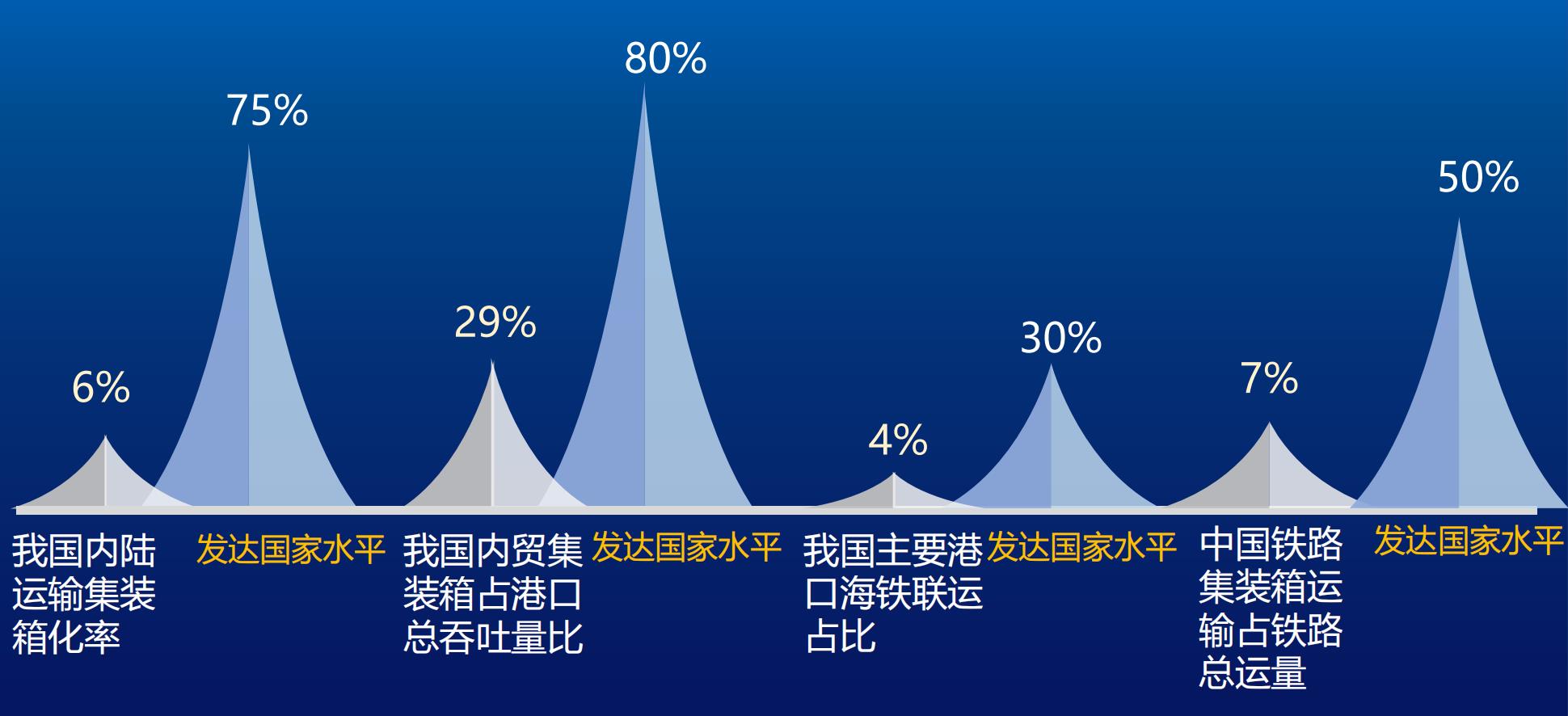 据中国集装箱行业协会数据显示,我国内陆运输集装箱化率仅为6%,发达国家水平则有75%;我国内贸集装箱占港口总吞吐量比为29%,发达国家水平则有80%;我国主要港口海铁联运占比仅为4%,发达国家水平则有30%;中国铁路集装箱运输占铁路总运量仅为7%,发达国家水平则有80%。