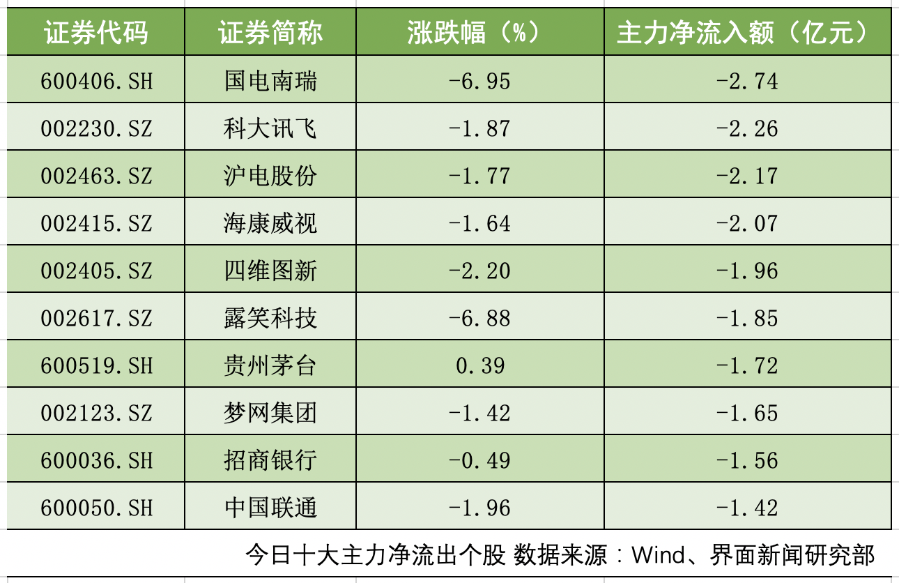 沪深两市共计18只个股主力净流出额超1亿元。国电南瑞(600406.SH)、科大讯飞(002230.SZ)、沪电股份(002463.SZ)主力净流出额位居前三,分别为2.74亿元、2.26亿元、2.17亿元。