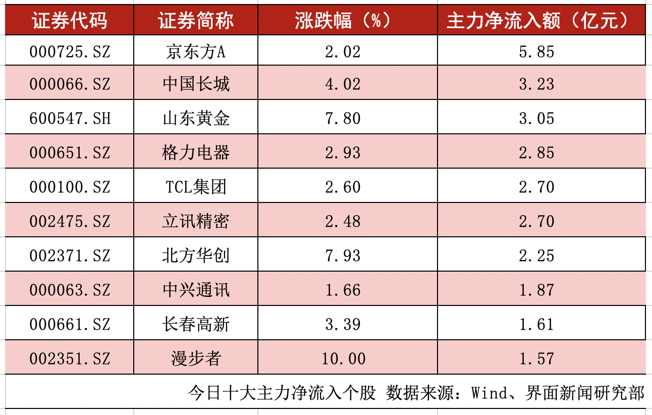 剔除尚未开板的新股及科创板股票,全天沪深两市主力净流入额超过1亿元的个股数量为18个。京东方A(000725.SZ)、中国长城(000066.SZ)、山东黄金(600547.SH)的主力净流入额位居前三,分别为5.85亿元、3.23亿元、3.05亿元。
