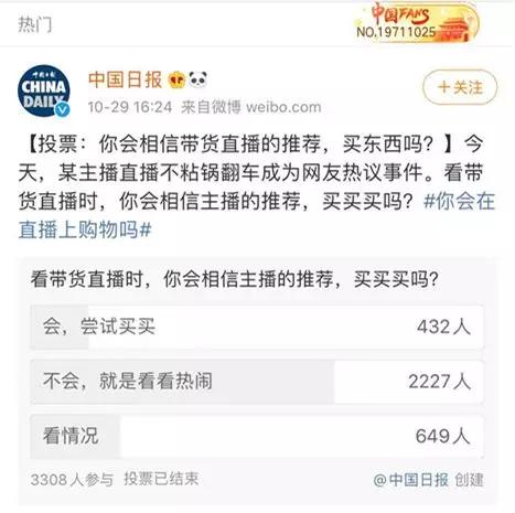 中国日报在上个月底就直播购物进行了一次投票,70%以上参与投票的网友都表示不会在直播购物买东西。部分网友认为看直播买东西浪费时间,商品质量大多没有保障。