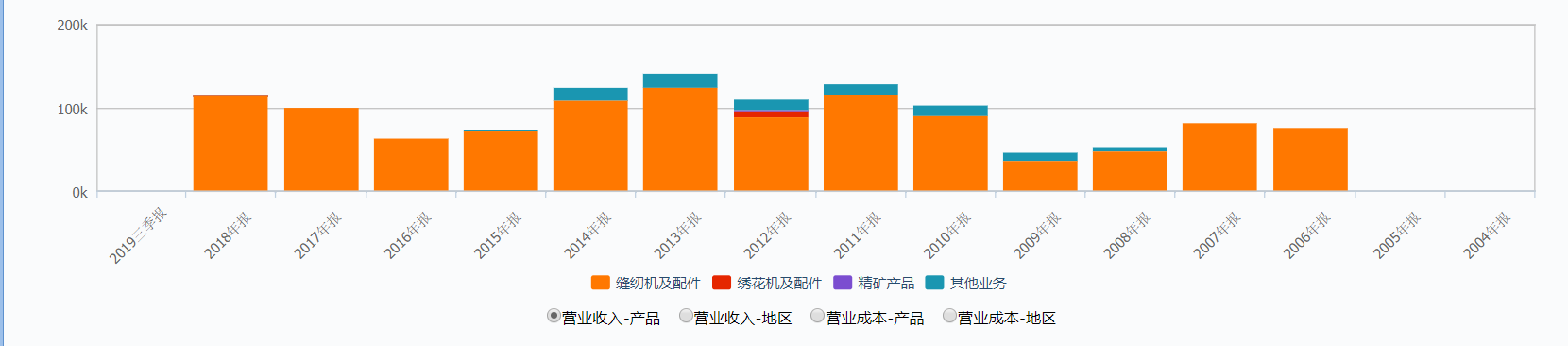 上市之后,受宏观经济形势的影响,工业缝纫机行业整体低迷,导致上市公司的主营业务收入下降,毛利也受到影响。2006年至2009年,占据公司营收90%以上的缝纫机及配件产品毛利率从26.47%降至13.14%,近乎腰斩。