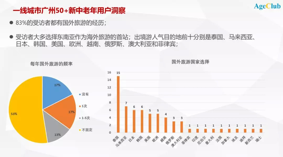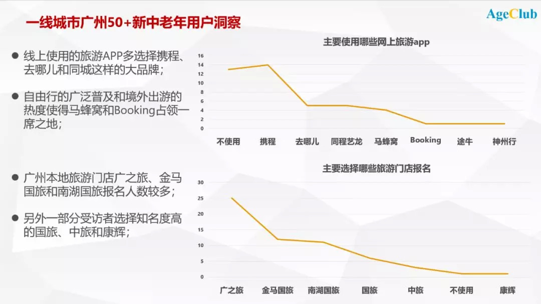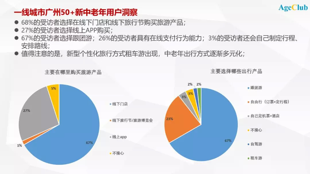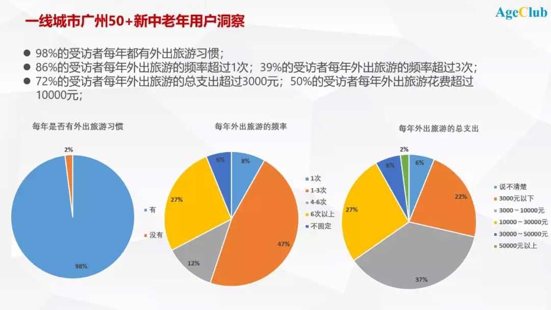 AgeClub旗下独立咨询品牌NewAgingPRO新老年洞察团队在过去的1个月时间,对广州市百位50+新中老年人群进入了深入的访谈,此前我们深度调研过北方一线城市的中老年群体消费行为;