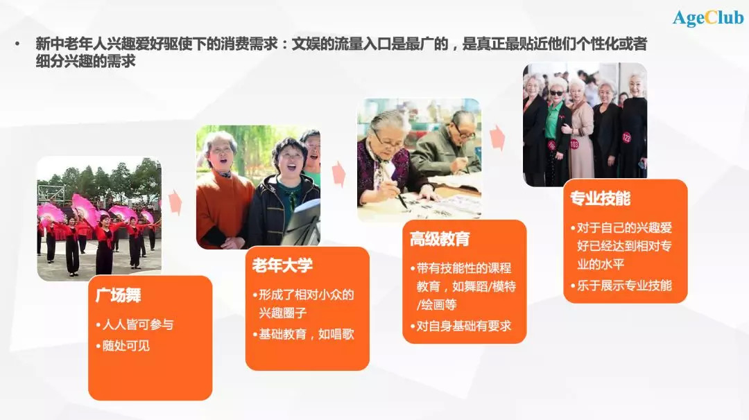 AgeClub之前对新中老年人兴趣爱好趋势的消费需求做过深入研究,将中老年释放兴趣爱好的过程分成四个递进阶段:广场舞、老年大学基础教育、高级教育、专业技能教育。