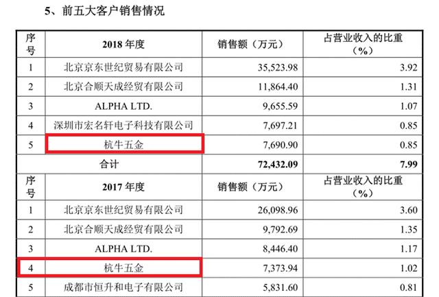 这63家公司,2018年与公牛集团发生了总金额超5亿的关联交易,其中多家公司的交易数据存在异常。以公牛集团前五大客户中的杭州杭牛五金机电有限公司为例。2016年-2018年度,公牛集团对其销售额分别为5203.04万元、7373.94万元和1885.50万元。这个销售统计中,还包含另外一个同一控制下主体,也就是杭州亮牛五金机电有限公司,这也是公牛集团最大的关联销售方。