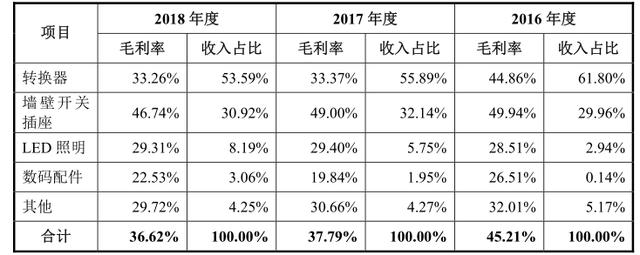 公牛集团招股书显示,2016年-2018年,公司主营业务毛利率分别为45.21%、37.79%、36.62%,呈逐年下滑趋势。