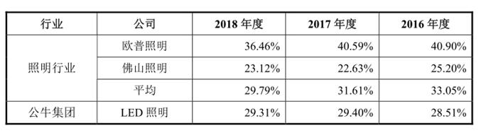 此外,2016、2017和2018年度公牛集团LED照明产品的毛利率也明显低于行业平均水平。