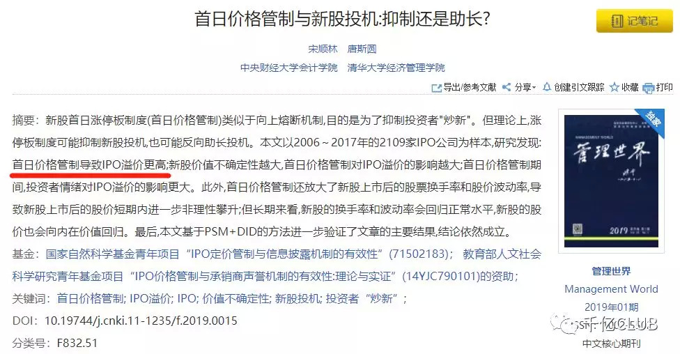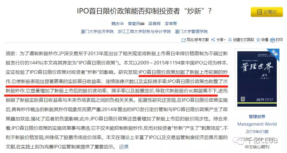 在科创板制度讨论时,新股前5个交易日放开涨跌幅限制的消息出台后引起了万众欢呼,被投资者认为是重大的改革利好。然而站在投资者的角度,涨跌幅限制真的是在抑制投资收益吗?可为君在查阅相关资料时,看到了两篇在今年1月份发表在我国一类核心期刊《管理世界》的两篇文章,分别对我国2009-2015年长达7年的新股数据和2006-2017年长达12年的新股数据进行实证研究,得出了同样的结论:新股首日涨跌幅限制,不但没有抑制股价快速回归真实价值,反而加剧了溢价现象的发生。
