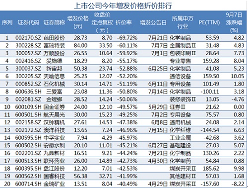 芭田股份的定增价格堪称奇葩,折价率高达69.72%,高居榜首。