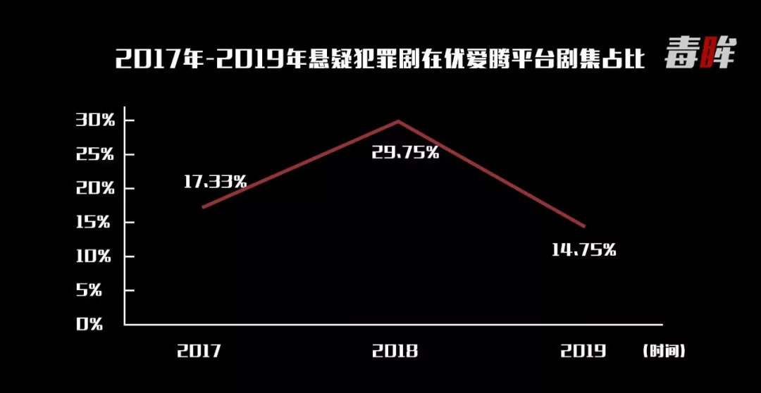 毒眸统计优酷、爱奇艺、腾讯视频三家流媒体平台的网剧备案发现,2019年悬疑犯罪剧在三家播映平台的剧集占比仅为14.75%,与2018年的29.75%相差甚远,同样低于2017年的17.33%,原本在流媒体平台吃香的悬疑犯罪剧集,也开始每况愈下。