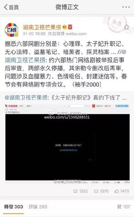 2016年1月,《无心法师》《心理罪》被突然下架,有网友就曾做过关于“尺度过大”的猜测。次月在全国电视剧行业年会上,广电总局电视剧司李京盛司长和网络视听节目管理司司长罗建辉分别在主题报告中指出,随着互联网发展的突飞猛进,总局将加强管理网剧和网络自制节目。未来网剧审查标准将与电视台一致,“电视不能播什么,网络也不行”。