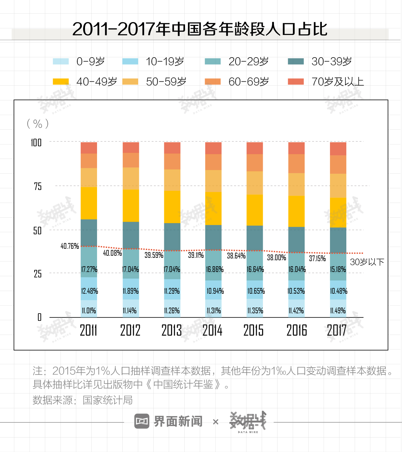 国家统计局抽样调查数据显示,中国30岁以下人口数量占总人口比连续下滑,这一数字从2011年的40.76%降至2017年的37.15%。