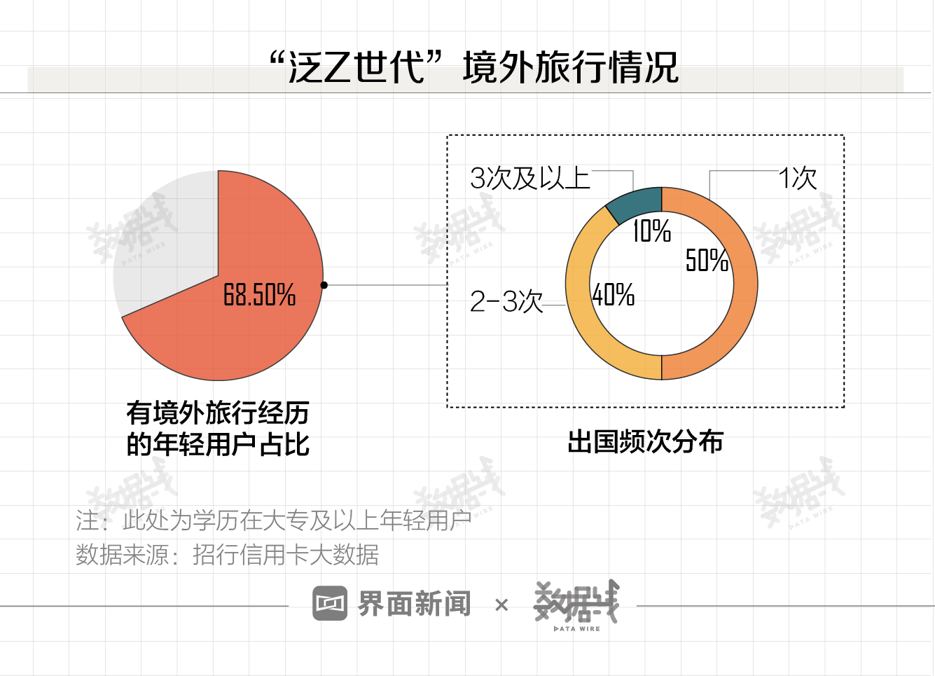 招行信用卡在用户研究中发现,大专及以上学历年轻用户中68.5%的人有境外旅行经历,去境外旅行的人群中50%每年出国1次,40%每年出国2-3次。境外消费数据显示,2019年,“泛Z世代”旅行过全球204个国家和地区。