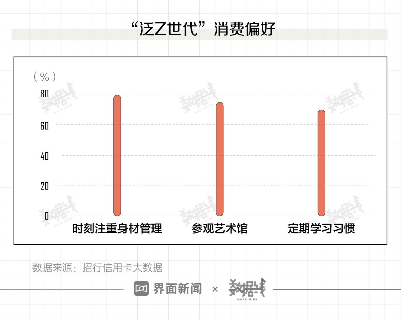 招行信用卡数据显示,30岁以下的年轻人中80%都时刻注重身材管理,75%的乐于参观各类艺术展馆,70%的都有定期学习习惯。