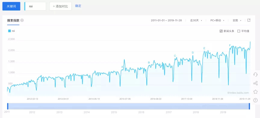 (关于“ROI”一词的搜索热度,逐年提升,十年翻倍)
