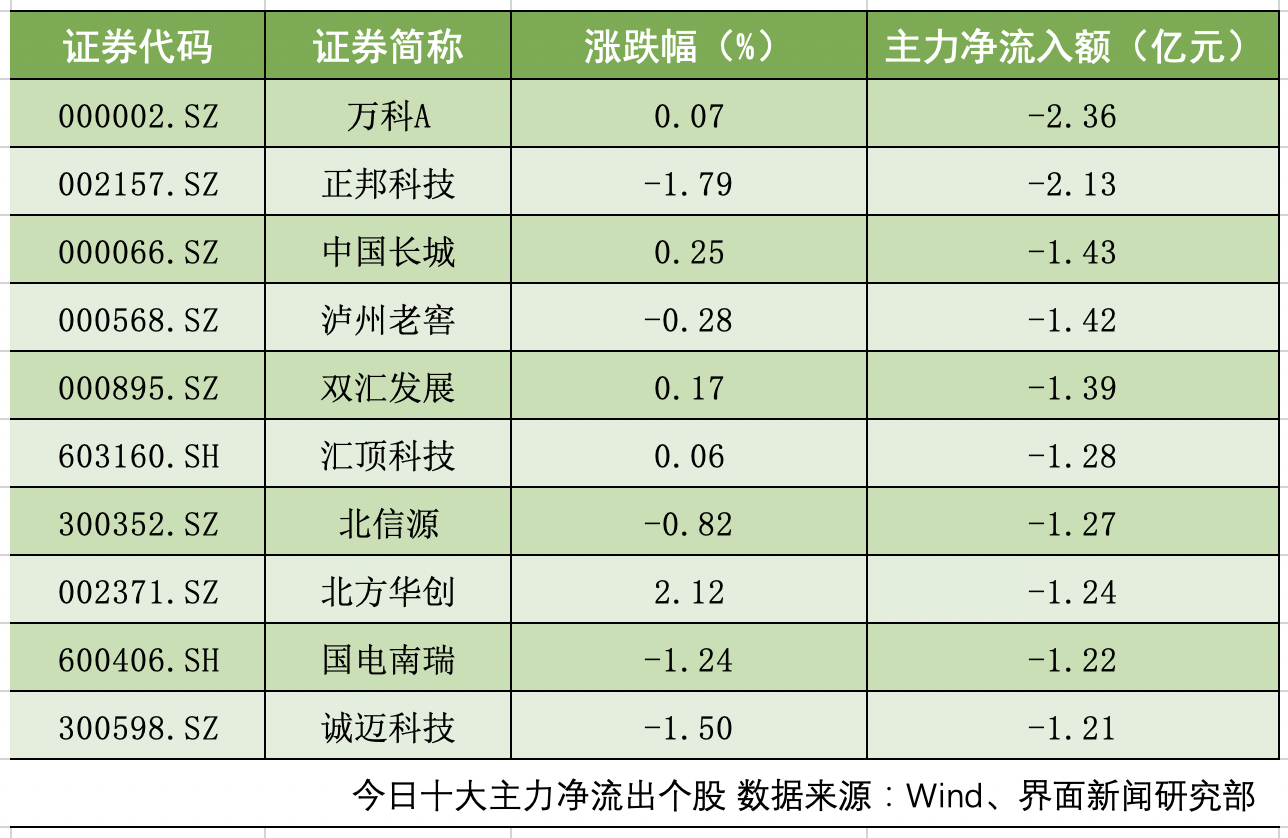 沪深两市共计18只个股主力净流出额超1亿元。万科A(000002.SZ)、正邦科技(002157.SZ)、中国长城(000066.SZ)主力净流出额位居前三,分别为2.36亿元、2.13亿元、1.43亿元。