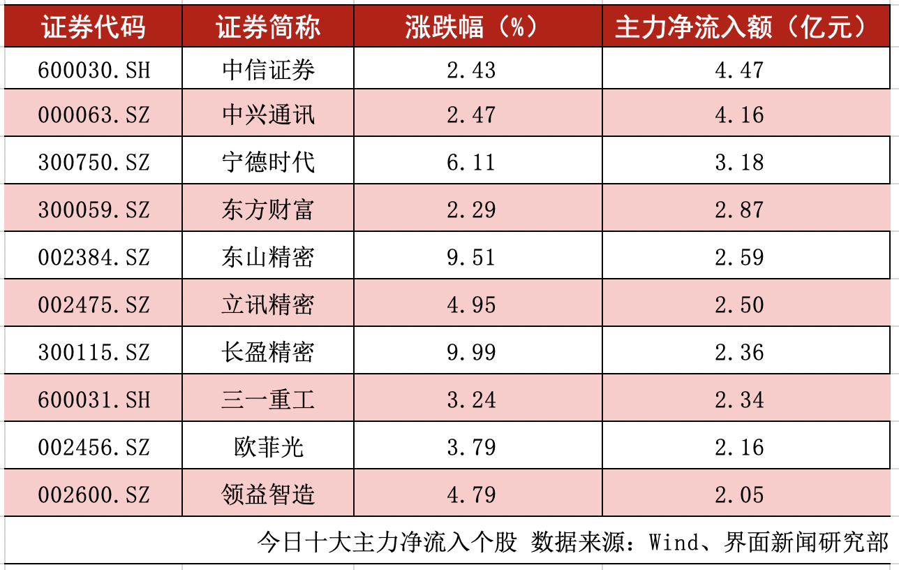 剔除尚未开板的新股及科创板股票,全天沪深两市主力净流入额超过1亿元的个股数量为32个。中信证券(600030.SH)、中兴通讯(000063.SZ)、宁德时代(300750.SZ)的主力净流入额位居前三,分别为4.47亿元、4.16亿元、3.18亿元。