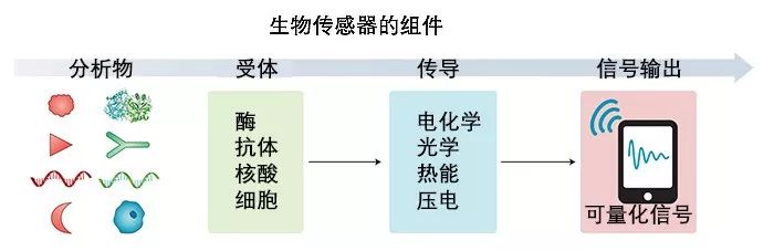 我们先来看看典型生物传感器的构成,它包含两个基本功能单元:负责选择性识别生物标志物(酶、抗体或DNA)的生物受体,以及负责将生物识别过程转换为有用信号的物理或化学传感器。