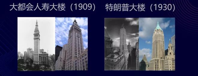 最后我们再看看两座纽约曼哈顿的写字楼,分别是1909年和1930年落成的大都会人寿大楼和华尔街40号(现在称为特朗普大楼)。