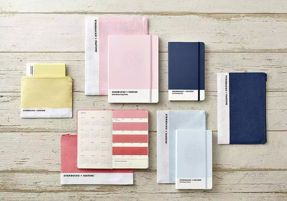 2017年末,Pantone与韩国星巴克合作,推出2018年新款手账行事历,并将该系列命名为“Color Your Life in Starbucks!”,该系列一共有5种小清新的 Pantone 色:Blooming Petal/Pink、Mystic Cloud/Sky Blue、Midnight Sky/Navy、Mellow Shine/Yellow、Sunset Blush/Coral
