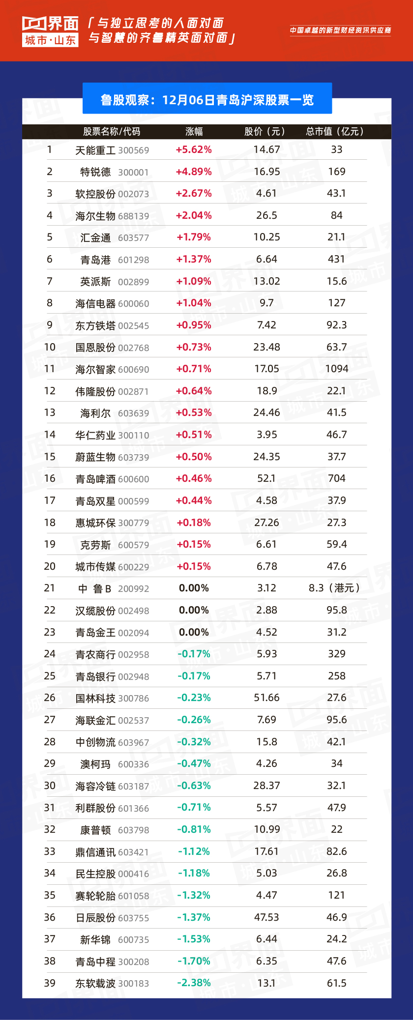 青岛市涨幅榜首:天能重工(300569)股价14.67元,涨幅5.62%,总市值33亿元。