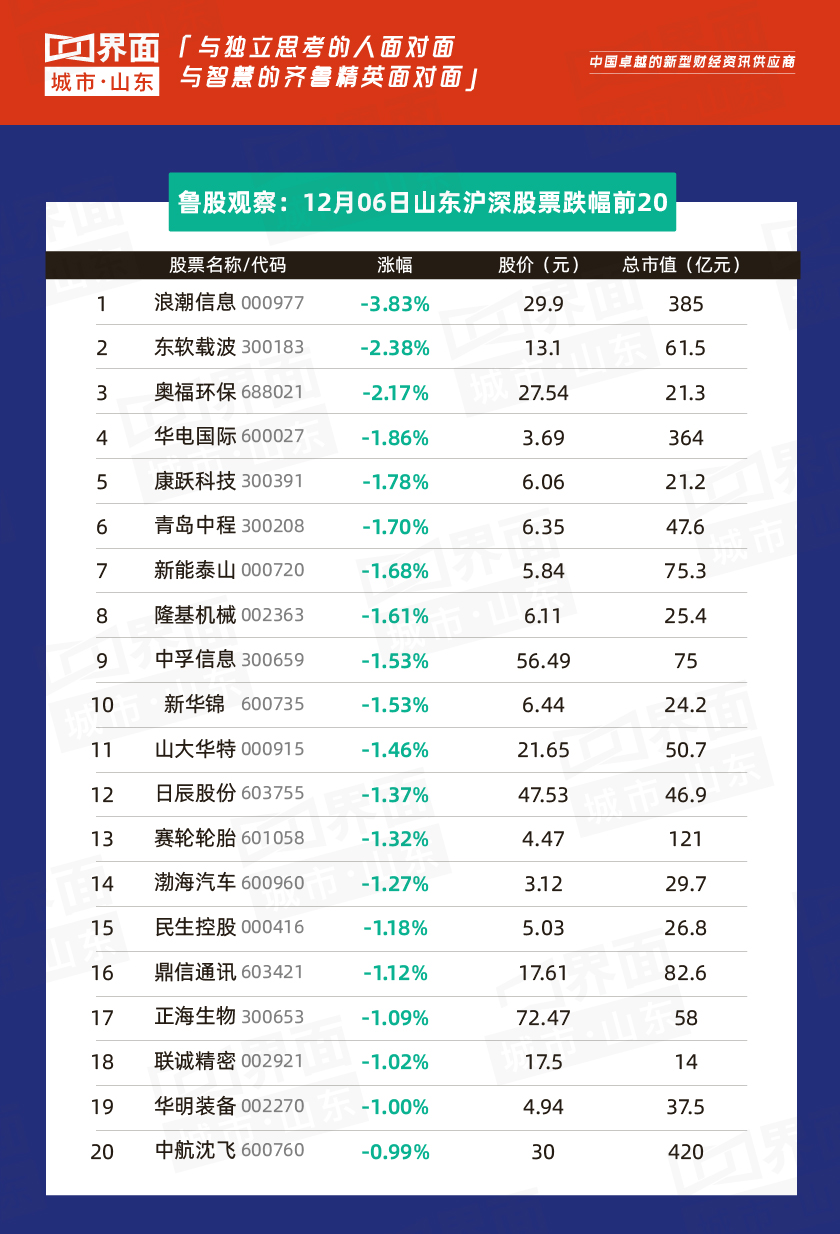 济南市跌幅榜首:浪潮信息(000977),股价29.9元,涨幅-3.83%,总市值385亿元。