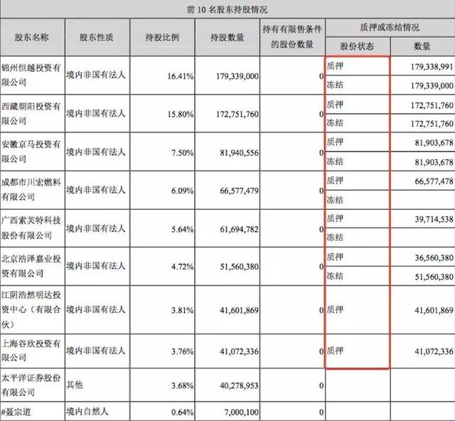公告显示,天夏智慧控股股东恒越投资,以及持股比例在5%以上的大股东朝阳投资、川宏燃料所持公司100%股份被冻结,另一家大股东京马投资冻结比例为99.95%。