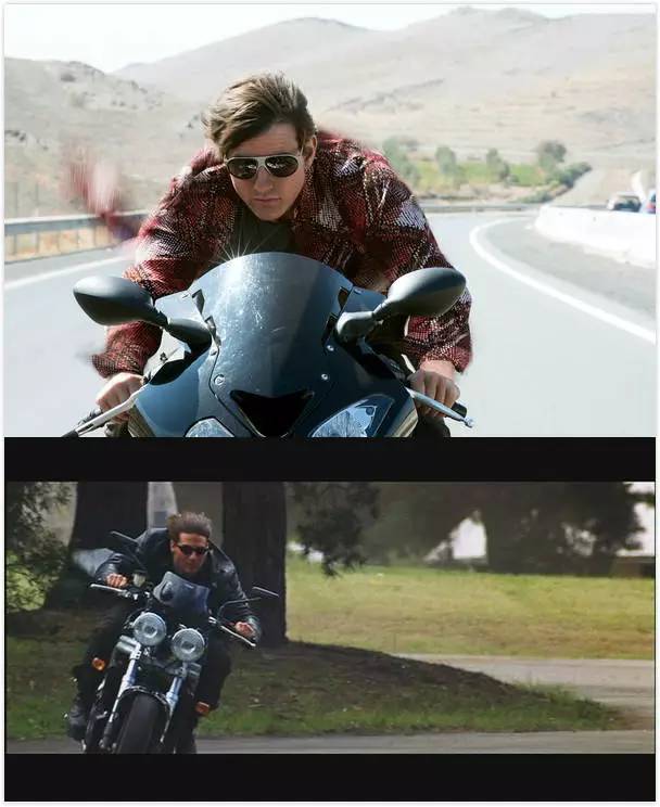 阿汤哥带个墨镜再上演摩托追车,完全是《碟中谍2》的桥段。