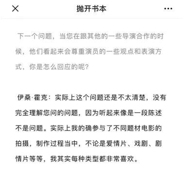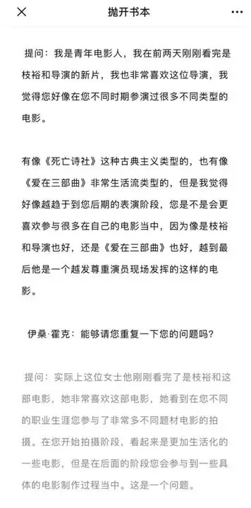 除了红毯上的尴尬,大师班现场也让观众们尴尬得捏了一把汗。在伊桑·霍克大师班最后的Q&A环节,一位青年导演发表了冗长的“演讲”式采访,而当一大段感想讲完之后,没人听明白问题到底是什么。网友们戏谑是“实心眼子伊桑·霍克遭遇中国特色窒息式Q&A ”。