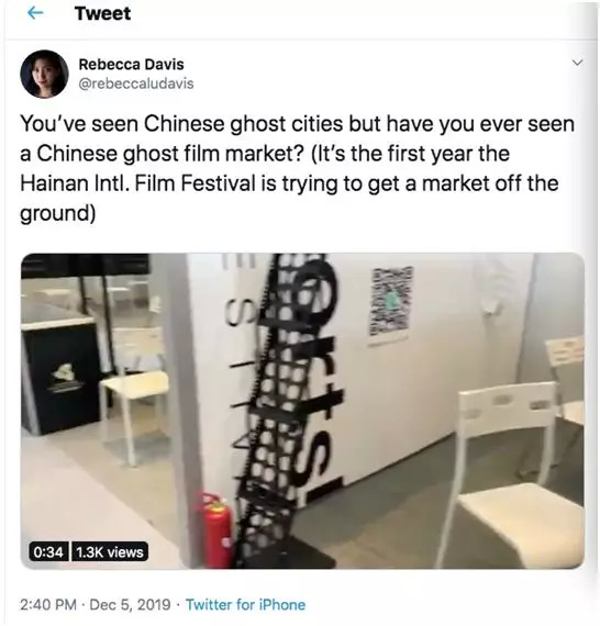 本届海南岛电影节首次增设的电影市场交易,也引起了吐槽。12月5日,参加电影节电影市场的Rebecca Davis在社交网站上发出视频,吐槽海南岛电影节的电影市场空无一人,堪比鬼市(ghost film market)。