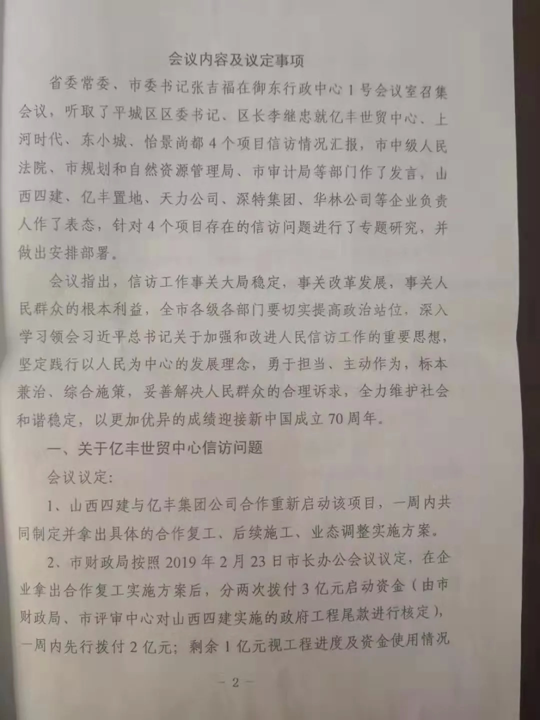 对于亿丰世贸中心,会议议定:山西四建与亿丰集团合作重新启动该项目;市财政局分两次拨付3亿元启动资金,一周内先行拨付2亿元(系市政府历年拖欠山西四建的工程款),剩余1亿元视工程进度及资金使用情况一次性拨付到位;市规划和自然资源管理局要积极争取政策,解决该项目土地出让金的滞纳金清缴问题;一个半月内,将该项目一期16亩、二期64亩,共80亩土地按程序出让,山西四建与亿丰集团要积极竞拍,通过住宅置换商铺,化解业主信访问题;市中级人民法院牵头,在山西四建、亿丰集团及其他债权人达成一致意见的情况下,解封一期土地,依法推进其他涉诉案件的协调和执行。