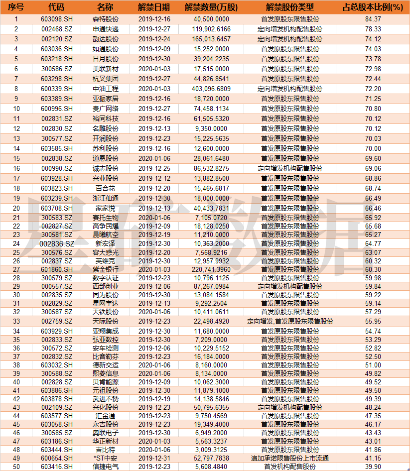 据星矿数据统计,12月9日至12月31日,A股12月共有227只个股解禁,解禁股市值超2800亿元。下周如通股份、高争民爆、兴业股份、名雕股份、家家悦解禁比例超过60%。