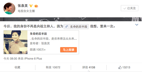 附:张泉灵微博发文《生命的后半段》