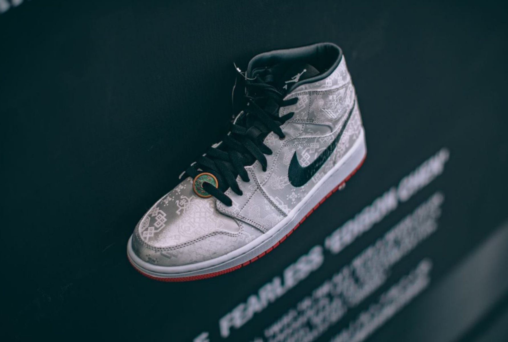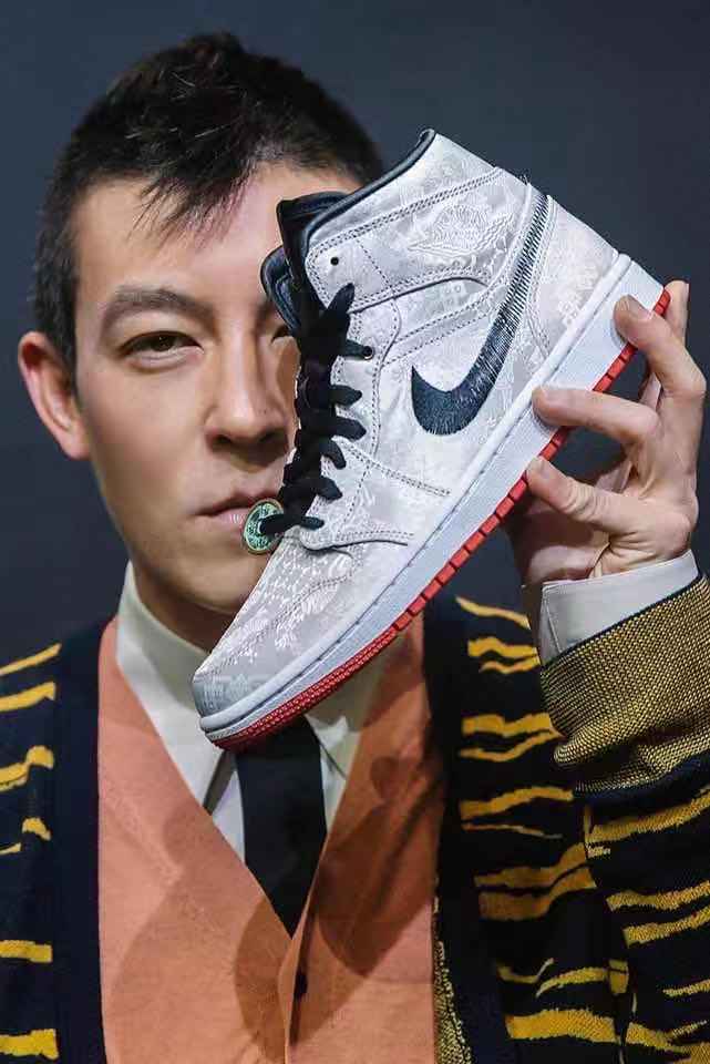 这双号称2019年下半年最具影响力的球鞋,鞋面以CLOT最为擅长的中国风花纹覆盖,标志性的白丝绸鞋面会因磨损情况不同产生不同破损效果,铜钱鞋带扣上还刻有“乔1(Air Jordan 1)”字样。