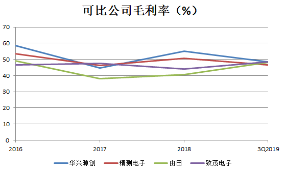 毛利率差距的缩小,可能是一个重要原因。2018年,华兴源创毛利率为55%,高于同行业的精测电子、致茂电子(2360.TW)、由田(3455.TWO),超过第二名精测电子4.3个百分点。到2019年三季度,华兴源创的毛利率和这些公司的差距快速缩小,为48.47%,和致茂电子、由田处于同一水平。