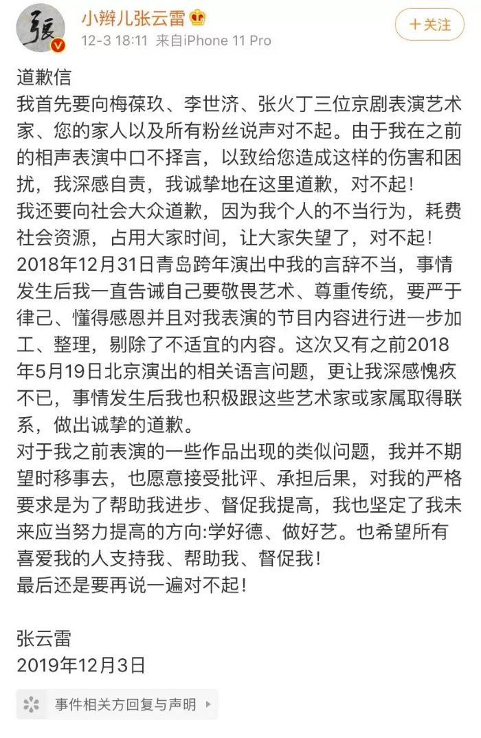 短短几个月,张云雷和杨九郎因为调侃地震灾民、京剧艺术家两次被官媒、党媒通报批评。12月3日,张云雷通过个人微博公开道歉。评论之中,支持者占了大多数。