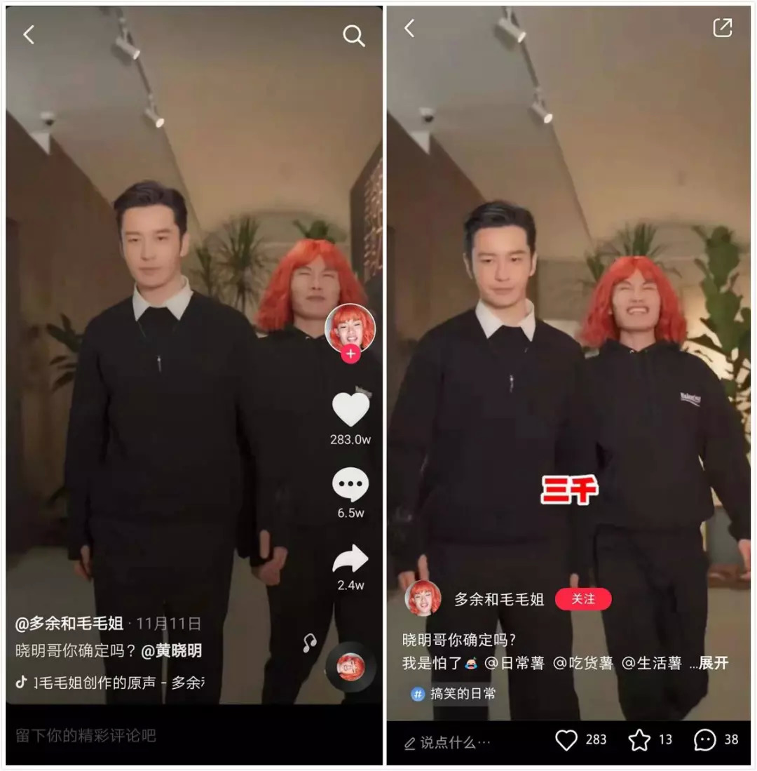 「多余和毛毛姐」作品。左为抖音,右为小红书
