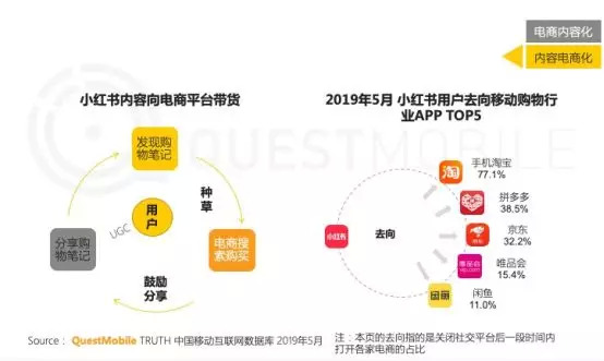 据QuestMobile《内容电商研究报告》显示,小红书用户在关闭平台后分别流向了淘宝、拼多多、京东、唯品会等其他电商平台。说明用户更多是在小红书看到“种草”内容,而后跳转至其他电商平台进行购买。