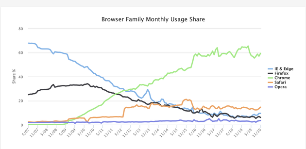 在IE浏览器和火狐浏览器占据绝对优势的浏览器市场,皮查伊领导的Chrome团队令人大跌眼镜地杀出一条血路,打了一场漂亮的后来居上战役。2010年夏天,Chrome浏览器市场份额首次突破10%,IE浏览器份额跌破50%,火狐浏览器34%;到了2012年夏天,Chrome市场份额首次超过IE和火狐,一举成为全球最大浏览器。