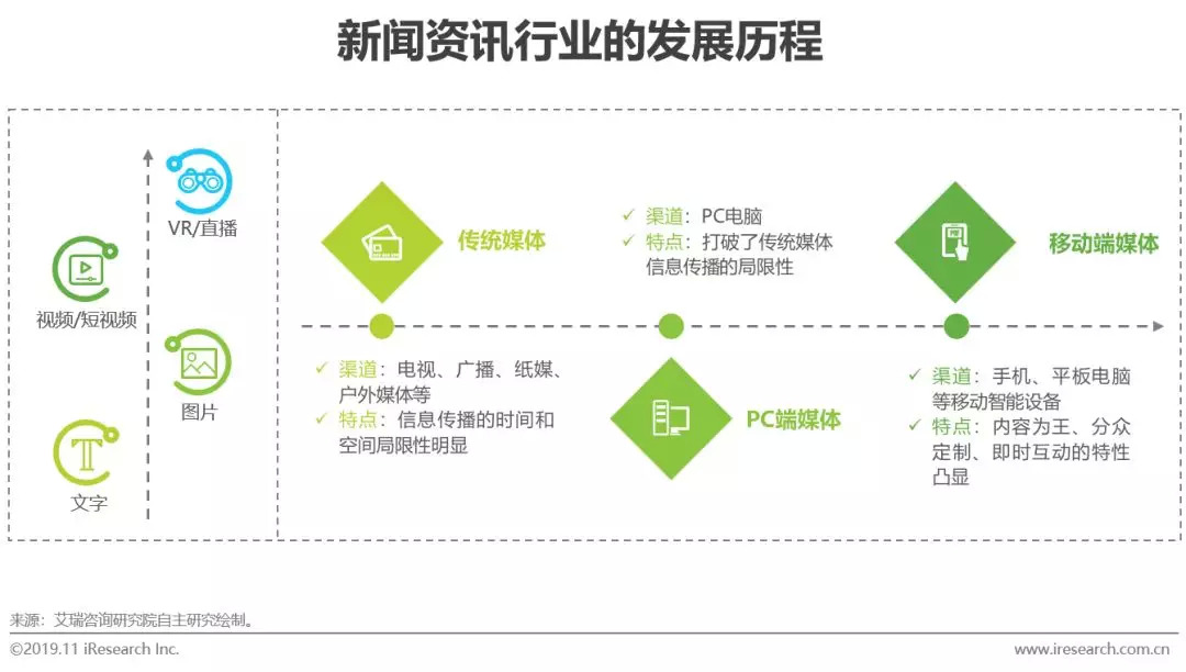 互联网的发展、网民内容偏好的升级、VR等技术风口的爆发,促进信息维度不断提升,获取信息的形式发生了巨大的变化,从文字、图片、视频/短视频到VR/直播,多元内容载体蓬勃发展。