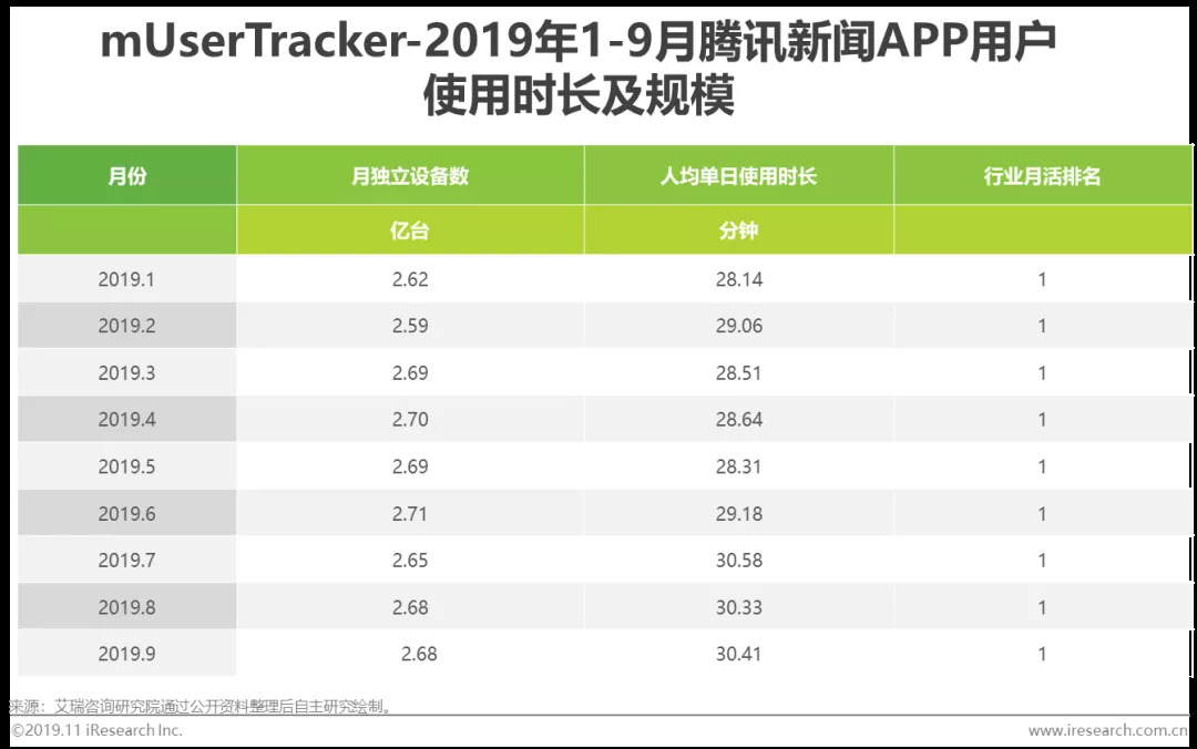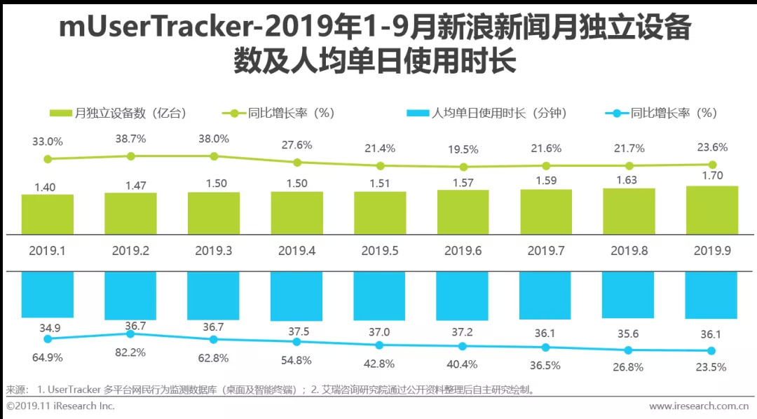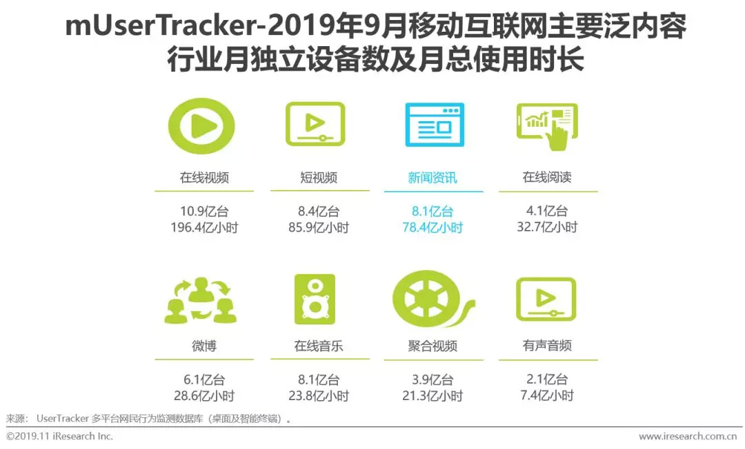 伴随着移动互联网的蓬勃发展,移动端已成为新闻资讯行业的主阵地,且发展迅速。2019年9月,新闻资讯行业月独立设备数超8亿台,人均单日使用时长( 47.53分钟)超短视频7.43分钟。
