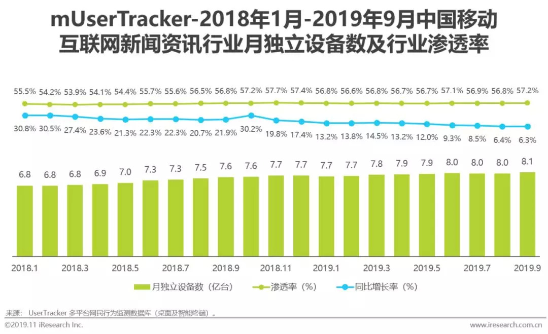 尽管新媒体社交平台分流了专业/垂直新闻资讯平台流量,但新闻资讯类应用的用户量及行业渗透率仍保持良性发展趋势,根据艾瑞咨询UserTracker数据显示,从用户流量来看,新闻资讯行业月独立设备数及行业渗透率均呈稳步增长趋势,截至2019年9月,月活超过8亿,渗透率达57.2%。