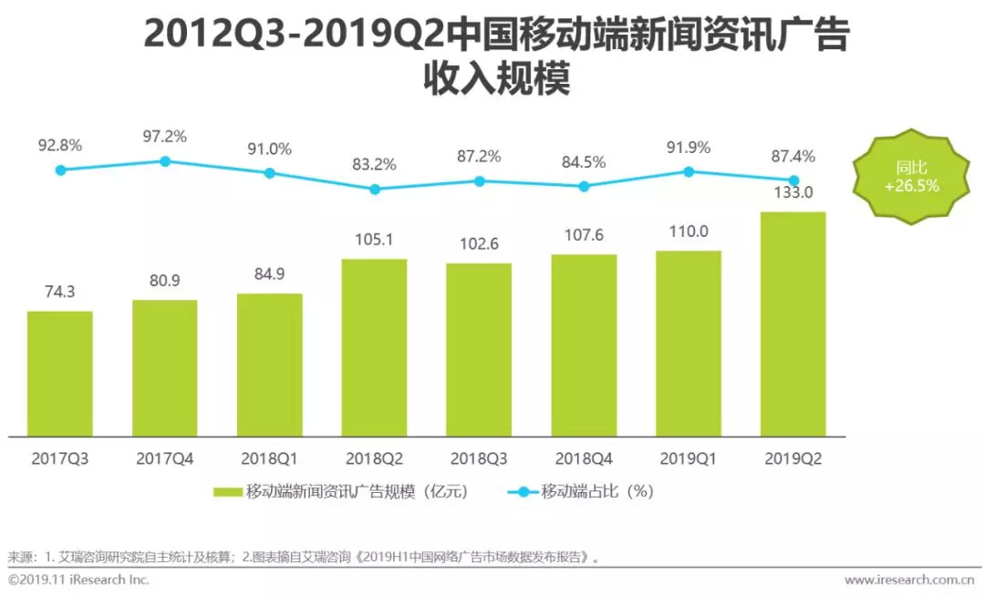 2019年第二季度,移动端新闻资讯广告规模达到133亿,在整体互联网新闻资讯广告中的占比约为87.4%,相较于上一季度有所下降,但同比增长26.5%。整体走势来看,各新闻平台在产业链上下游进行的深度布局,类似趣头条等一众专注于下沉市场开发的资讯平台的发展,未来移动新闻资讯平台将会为各品牌提供更多营销机会。