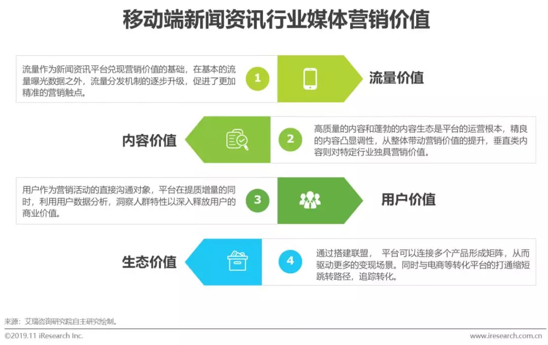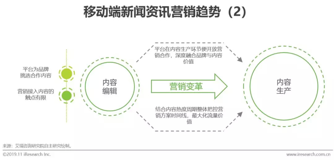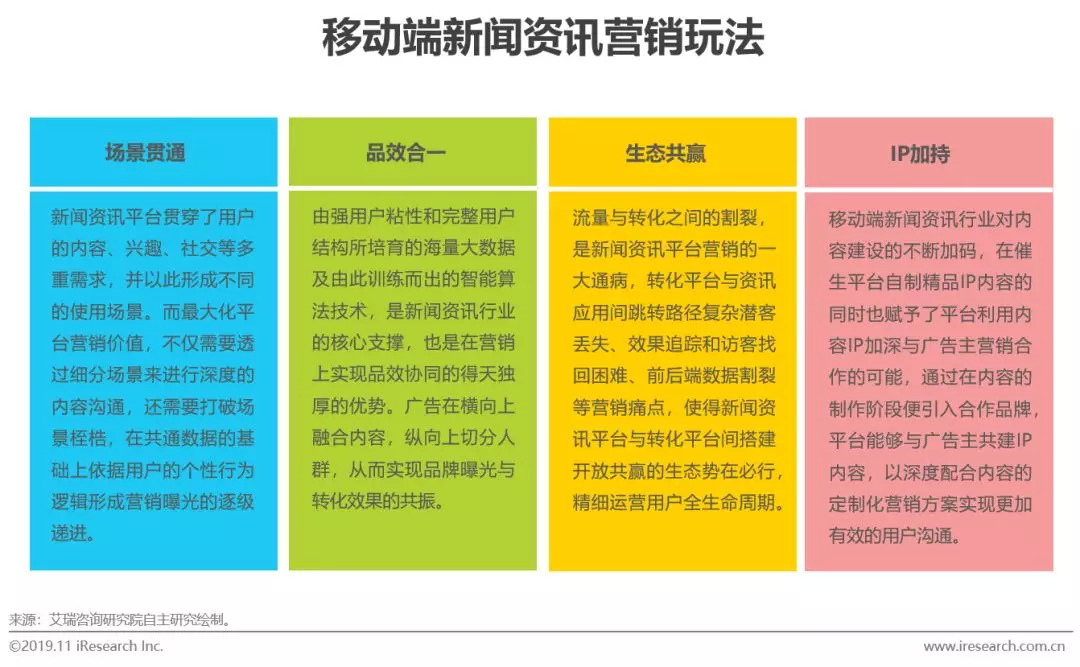 内容变革影响媒体价值并进而改变营销策略,重内容、优分发、富形式、重互动、强数据成为移动端新闻资讯行业的营销趋势,品效合一、场景贯通、生态共赢、IP加持是重要的营销玩法。