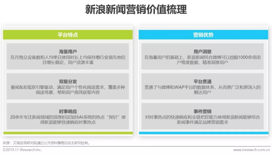 作为深耕新闻资讯领域二十余年的老牌媒体平台,新浪新闻积淀出海量的用户体量,且仍保持着稳定的增长水平,截至2019年9月,月独立设备数接近1.7亿台,人均单日使用时长达36.1分钟,时长粘性位居第二,具有深厚的流量价值。伴随着AI技术的发展,新浪新闻将深厚的新闻运作经验与AI热点“探针”相结合,赋能采编团队建模整个新闻热点的传播过程,实时监控热点变化走向,把控营销发力点。此外,在数据价值的挖掘上,新浪新闻一开始便从底层打通与微博、WAP端的内容、数据、账号体系,全方位洞察用户特征,立体化分发内容与营销信息,从而更广泛和更深入的触达用户。