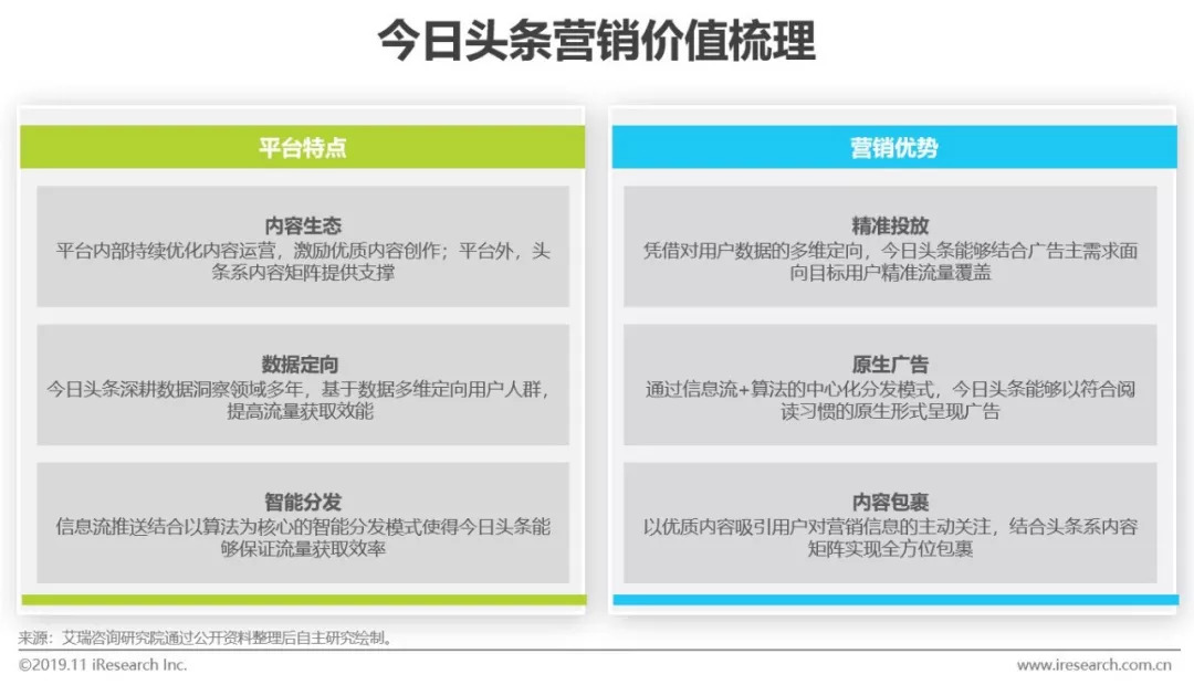 作为国内率先应用以算法为核心的智能分发模式的移动端新闻资讯平台,今日头条多年来积累了深厚的数据基础并且不断迭代与优化智能推荐引擎。通过数据定向和智能分发,今日头条能够以十分贴近原生的形式完成符合广告主需求的精准投放,并且结合后续数据跟进调整投放策略,辅助广告主更好决策。同时,今日头条不断加码优质内容建设,吸引用户从“被动接受”向“主动获取”转变,并结合头条系内容矩阵打造高品质内容生态。