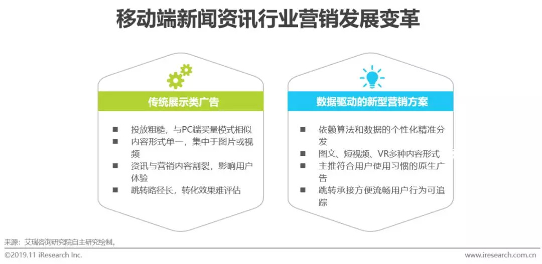 移动端新闻资讯行业发展之初,平台多为传统门户网站APP化的产物,广告营销运作较PC时代的买量模式并无根本差异,投放粗糙,欠缺流量运营技巧,更难以形成有效的转化路径。在内容上,也存在形式单一,无法与资讯内容统合的问题,伤害用户阅读体验的同时影响营销效果。但随着算法驱动的分发模式和数据挖掘能力的不断成熟,以及内容形式的丰富,新闻资讯行业营销发展实现了深耕精细化运营的变革。