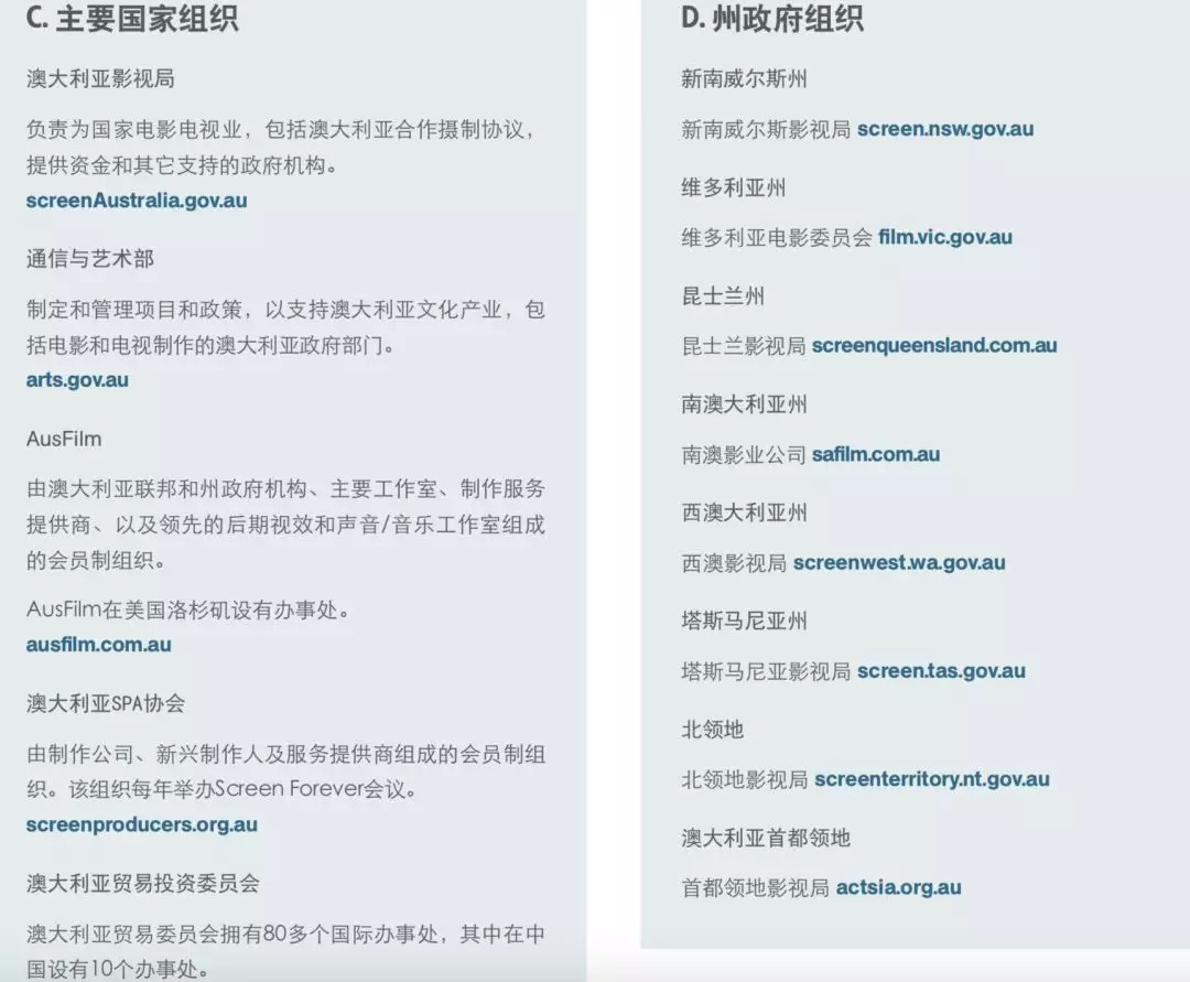 去澳洲拍戏的事项非常容易在网上检索到,有官方中文网站和资料。澳大利亚电影国际推广署(https://www.ausfilm.com.au/china/)可以帮忙联络执行制片人、制片服务公司,解决人员、场地、摄影棚、旅行和住宿等问题。
