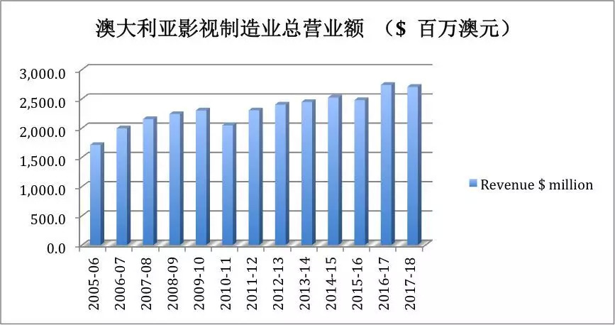 IBISWorld公布的数据提到,2017 - 2018年澳大利亚影视行业总营业额约为27亿澳元,总利润约为2亿澳元。总体是一个稳中有升的趋势。