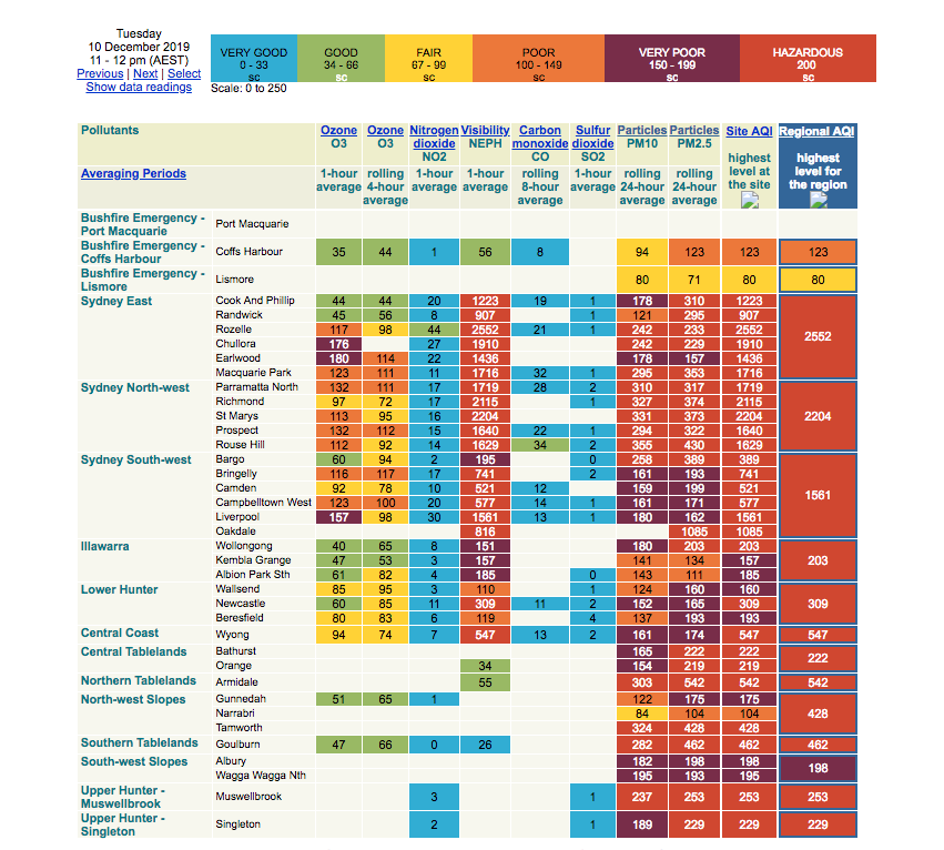 当地时间上午9点至10点间,新南威尔士州环保部在悉尼西北部麦考瑞公园(Macquarie Park)地区所测得的空气质量指数(AQI)2214,已达到“危险”水平下限值(200)的11倍。截至发稿,悉尼人口稠密地区全部处于有毒气体的笼罩之中。