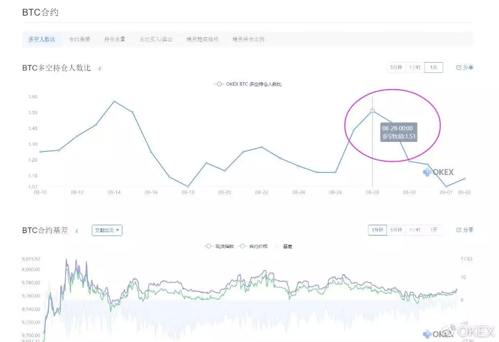 在8月28日时,合约市场做多账户比做空账户数多了一半。“市场上多方和空方的总仓位价值是相等的。总仓位价值相等,而持有人数不同,那就说明持有人数多的一方人均仓位价值较小,以散户为主。当多空人数持仓比大到一定程度时,就说明散户倾向于看多,而机构和大户倾向于看空。”